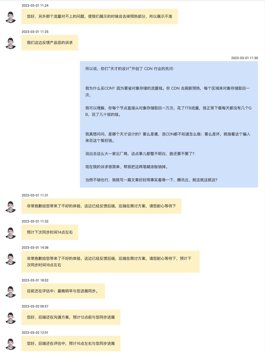 听到这样的解释,我都要笑喷了。我为什么买CDN?因为要省对象存储的流量钱。CDN 去刷新预热,这是云厂商自己系统内部的流量,为啥要挂在用户身上付费?但是你刷新预热一下,一下花掉了我直接走对象存储下载一年都用不了的钱。