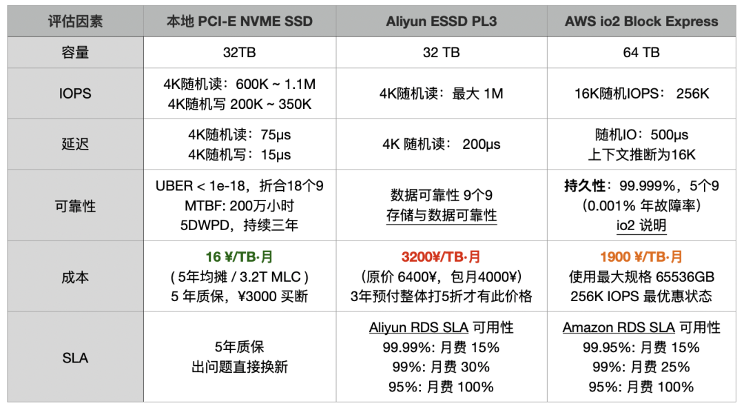 云存储资源的定价则更为离谱,一块常见的 3.2 TB 规格企业级 NVMe SSD 有着极为强悍的性能、可靠性与性价比,批发价 ¥3000 元出头,全方位吊打老存储。然而,在云上同样的存储,就敢卖你 100 倍的价格。相比直接采购硬件,AWS EBS io2 的成本高达 120 倍,而阿里云的 ESSD PL3 则高达 200 倍。
