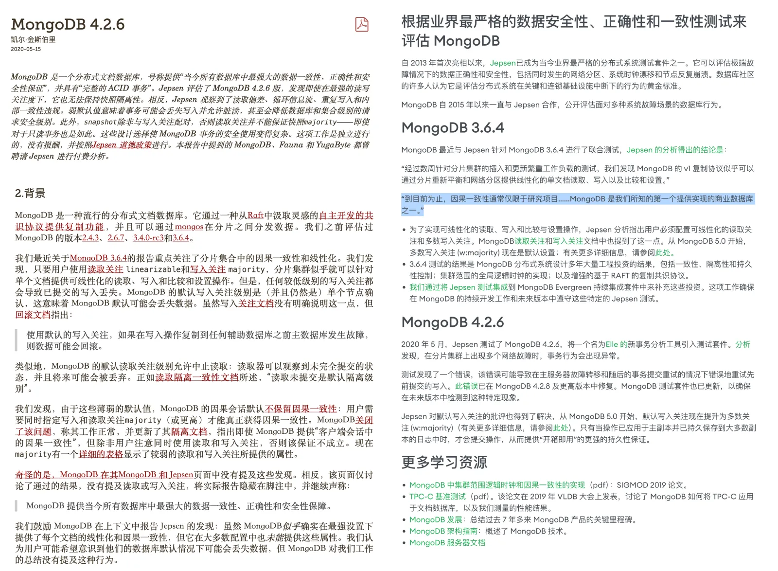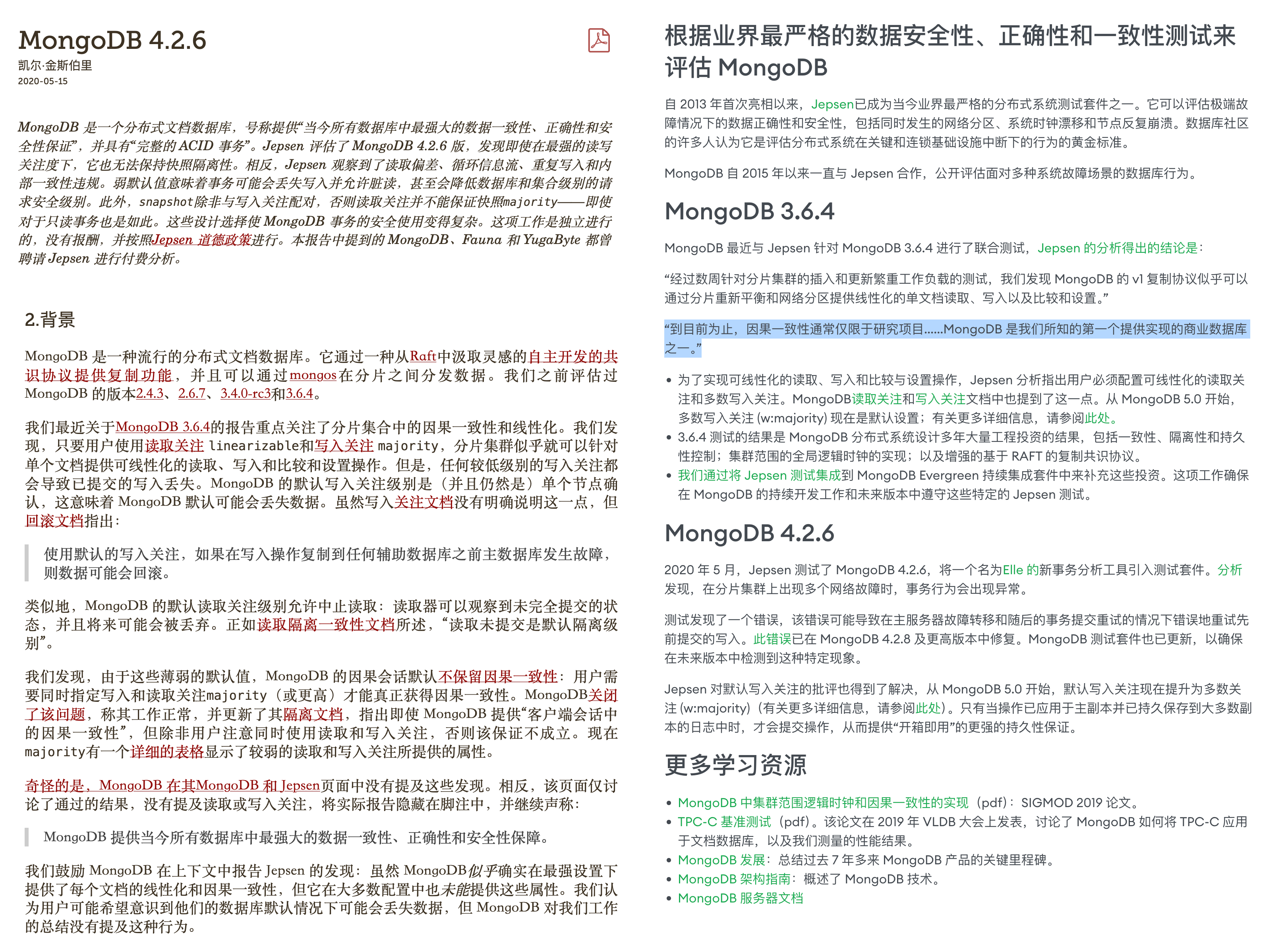 对于数据库来说,正确性至关重要 —— 中立的分布式事务测试框架 JEPSEN 对 MongoDB 的正确性做过评测:结果可以用 “一塌糊涂”形容(BTW:另一个难兄难弟是 MySQL)。