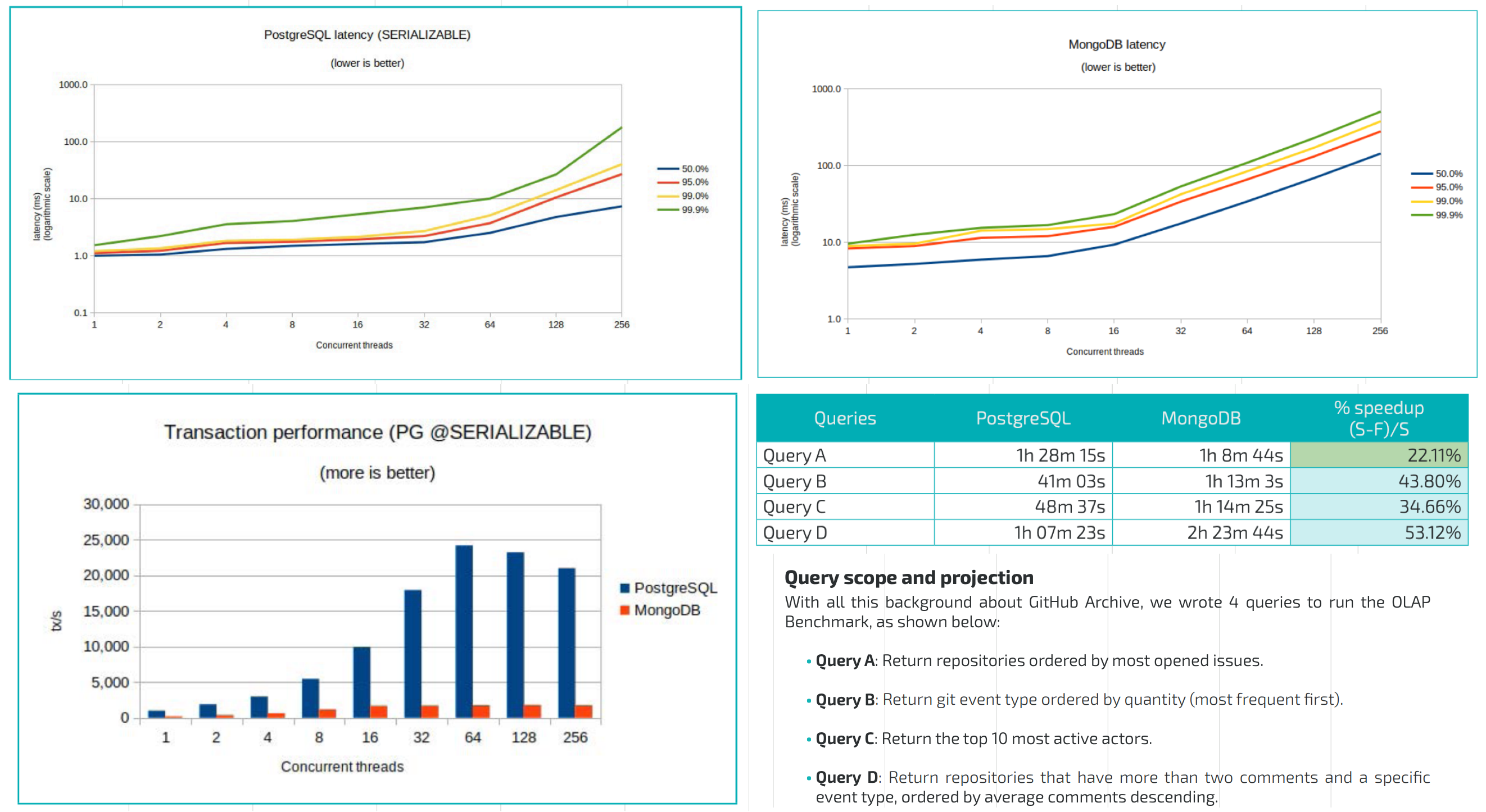 另一份更近一点的性能对比 着重测试了 JSONB / GIN 索引下的表现对比,得出的结论也是:PostgreSQL JSONB 列是 MongoDB 的替代。