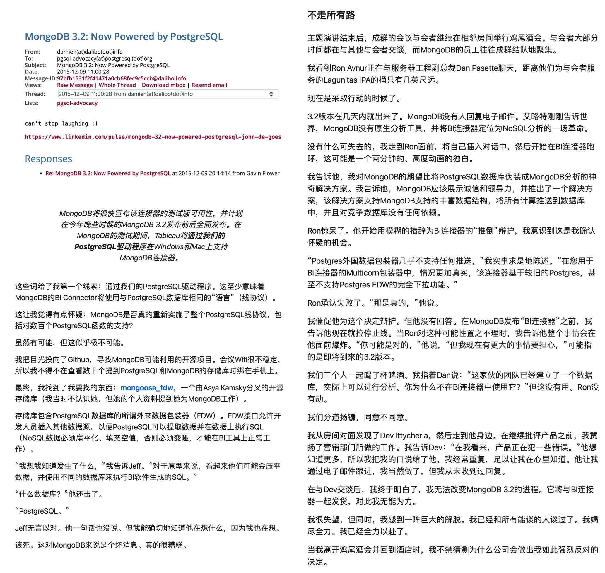 在所有关于 MongoDB 大忽悠的故事中,最让人印象深刻的是 LinkedIn 上的这篇《MongoDB 3.2 —— 现由 PostgreSQL 强力驱动》 。 这篇文章的精彩之处在于,它是由 MongoDB 合作伙伴发出的血泪控诉:MongoDB 无视了自己合作伙伴的忠言劝告,拿了一个 PostgreSQL 伪装成自己的分析引擎,并在发布会上忽悠用户。