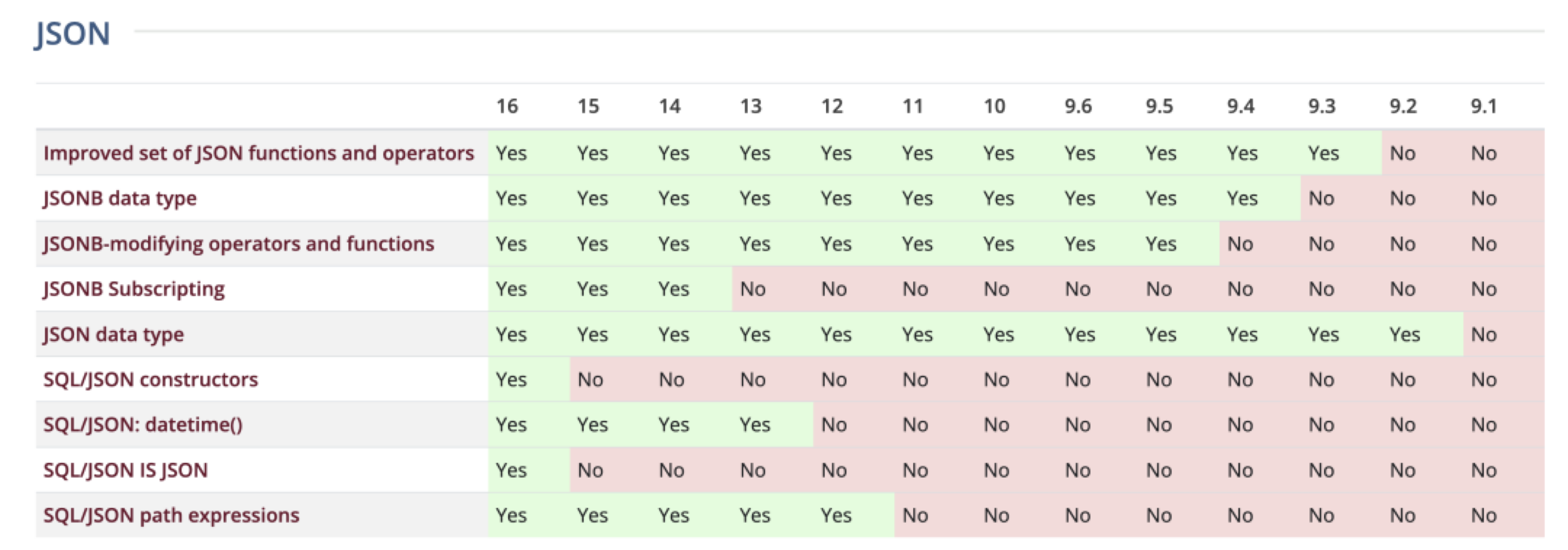 PostgreSQL 的 JSON 支持是所有关系型数据库中最成熟与最早的(2012-2014),早于 SQL/JSON 标准或者说直接影响了 SQL/JSON 标准建立(2016)。 更重要的是,它的文档特性实现质量很高。相比之下 —— 同样在营销上号称支持 JSON 的MySQL,实际上是个简陋的 BLOB 换皮,跟 9.0 向量类型有一拼)。