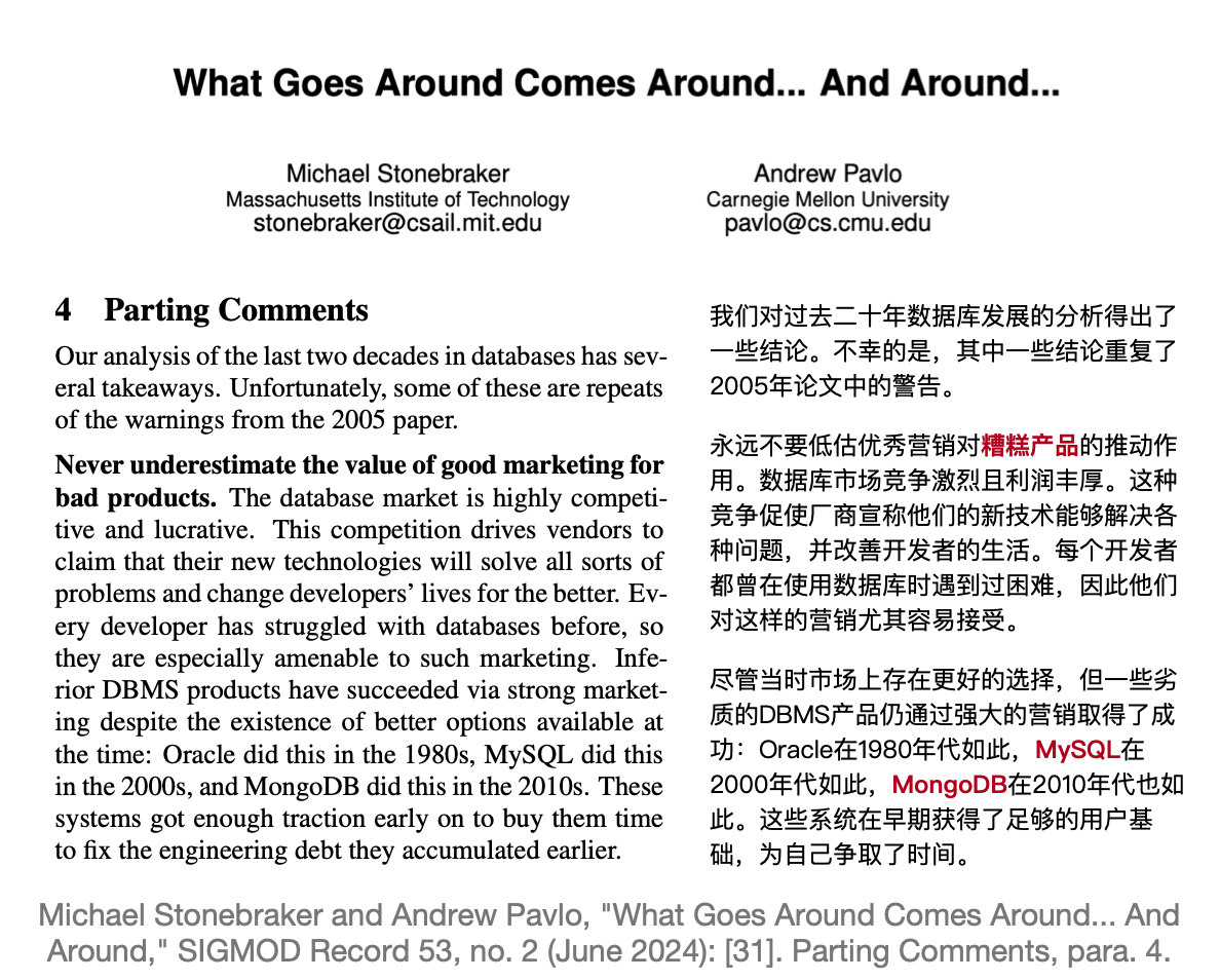 图灵奖得主,数据库祖师爷 Stonebraker 老爷子在最近在 SIGMOD 2024 发表的名著级论文《What goes around comes around… And Around》中对此有过精辟的评价:“绝对不要低估好营销对烂产品的影响 —— 比如 MySQL 与 MongoDB”。
