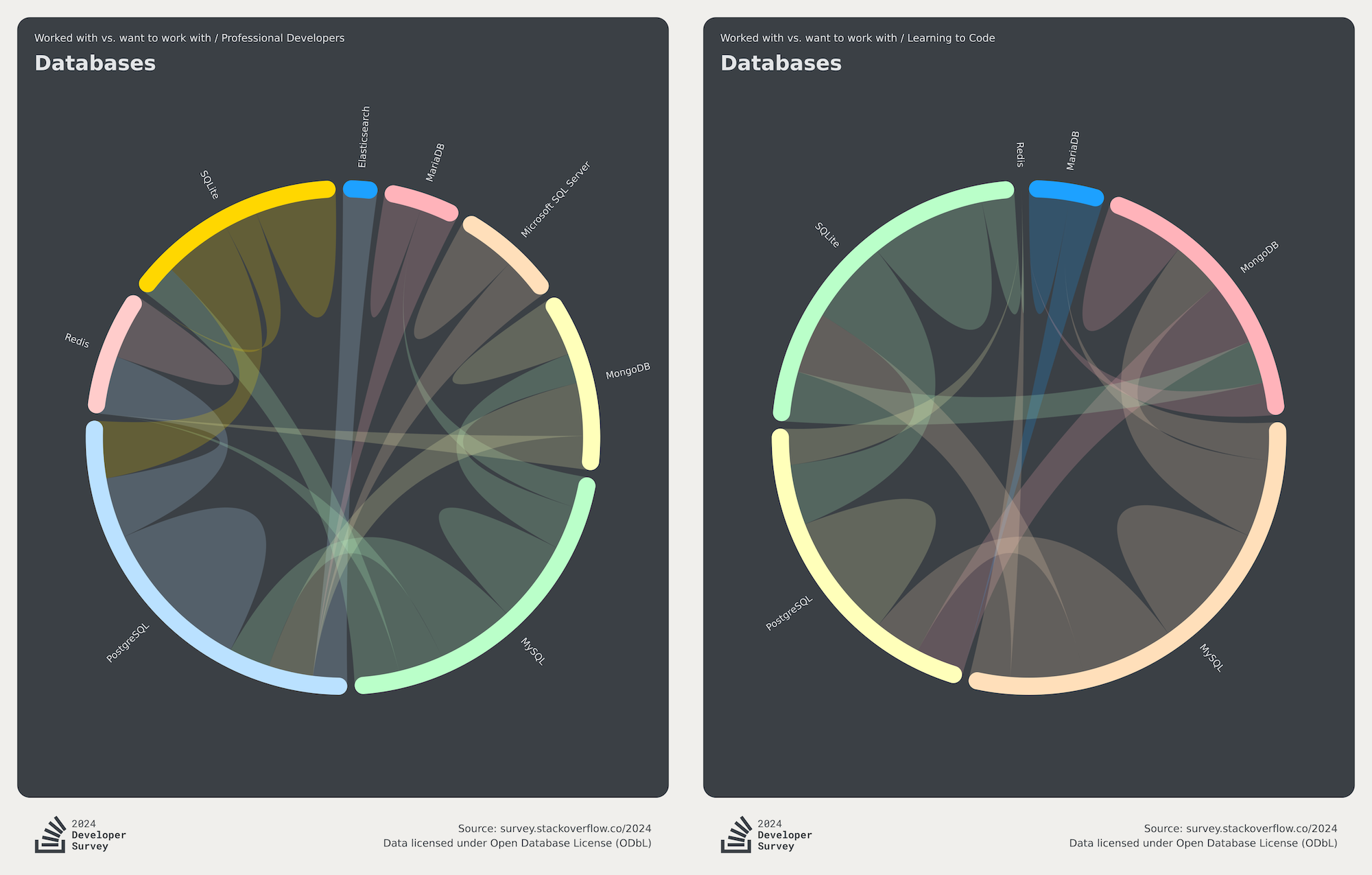 MongoDB 和 MySQL 属于那种典型的 “面向初学者” 的数据库,针对小白做了许多无底线讨好性的妥协设计 —— 从统计中不难看出它们在新手中的使用率比专业开发者中更高。 与之相反的则是 PostgreSQL,在专业开发者中的使用比例要比新手中高得多。