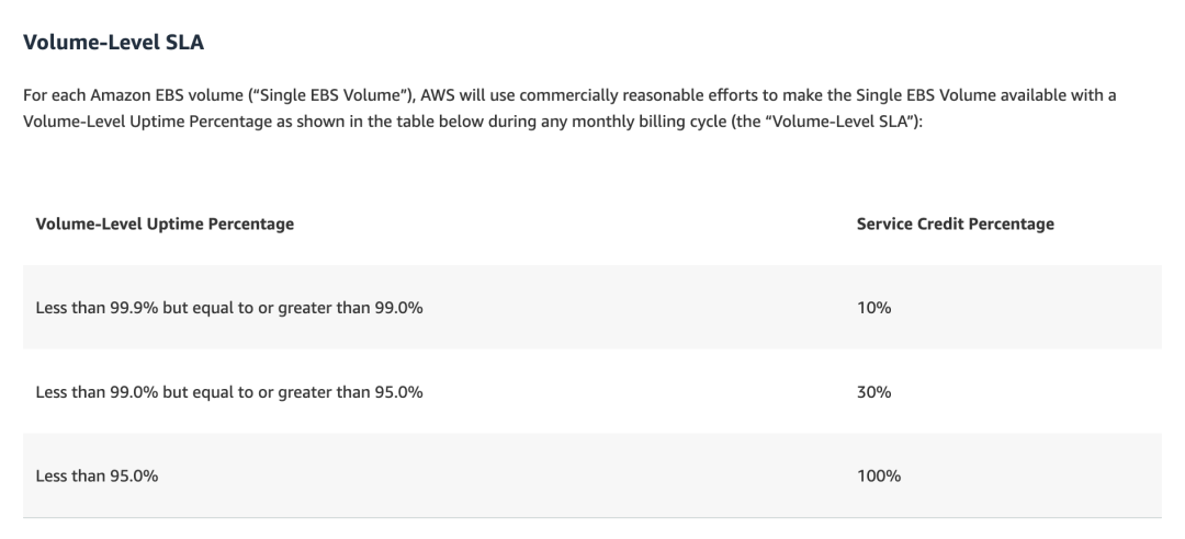 “Experts” also liken purchasing “cloud services” to buying insurance: “An annual failure rate of 0.02% may seem negligible to most, but a single incident can be devastating, with the cloud provider offering a safety net.” This sounds appealing, but a closer look at cloud providers’ EBS SLAs reveals no guarantees for reliability. ESSD cloud disk promotions mention 9 nines of data reliability, but such claims are conspicuously absent from the SLAs. Cloud providers only guarantee availability, and even then, the guarantees are modest, as illustrated by the AWS EBS SLA: