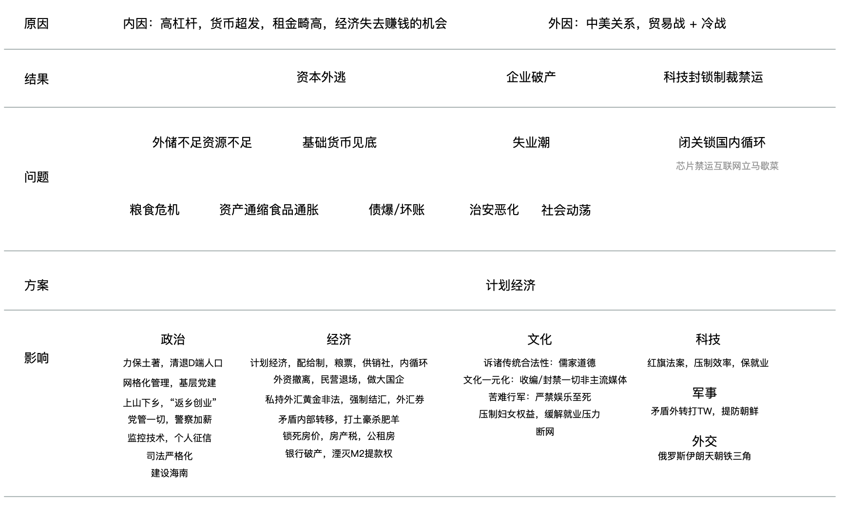 上面是贸易战与冷战的三个直接后果,资本外逃,企业破产,科技封锁。概括地讲,外储流失则基础货币减少,流动性紧张引发债务危机进入明斯基时刻,引发资产抛售潮与资产通缩。与此同时超发货币从资产端流出,又不能换美元跑掉,那必然会冲击日常必须品导致食品房租价格通天,必需品通胀。最终形成资产通缩与必需品通胀的经济奇观。外企撤资与民企破产则引发大面积的失业潮,房奴断供引发抛售房产,失去经济来源的人报复社会引起治安恶化(例如大下岗时的刨锛党),处理不慎甚至会引发社会动荡,遍地张献忠。这些直接后果又会进一步引发其他问题,这就是所谓的“系统性风险”,下面依次展开。