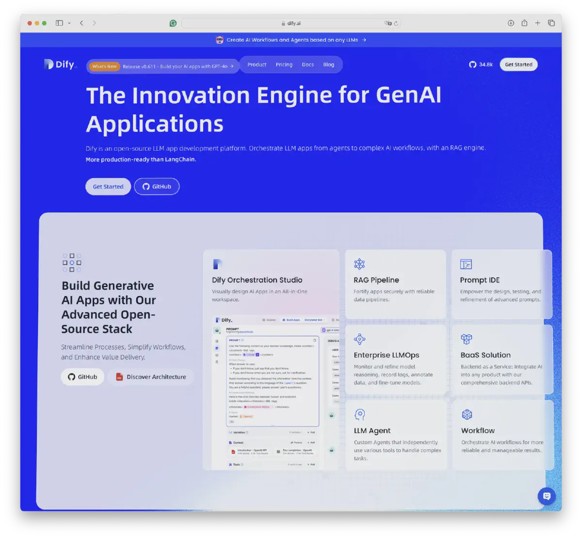Dify 是一个生成式 AI 应用创新引擎,开源的 LLM 应用开发平台。提供从 Agent 构建到 AI workflow 编排、RAG 检索、模型管理等能力,帮助用户轻松构建和运营生成式 AI 原生应用。