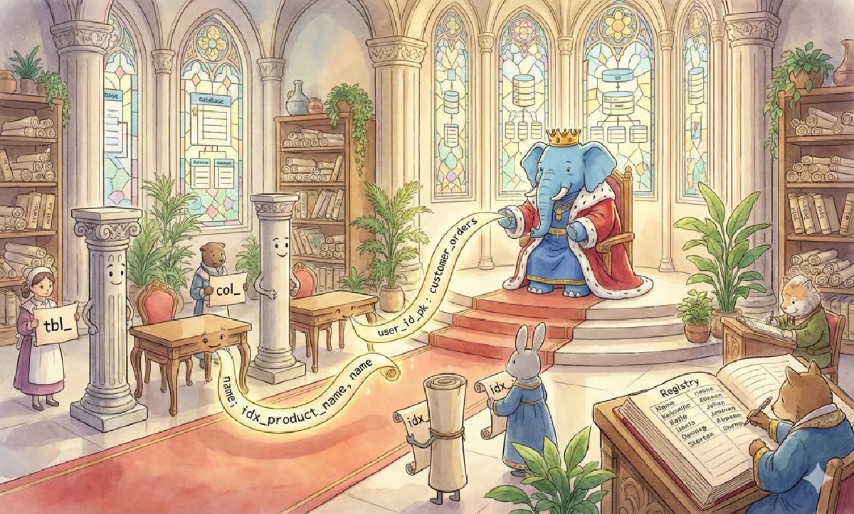 管理数据库和软件,其实与管理子女或者宠物类似,都是需要花心思去照顾的。而起名字就是其中非常重要的一项工作。肆意的名字(例如 XÆA-12,NULL,史珍香)很可能会引入不必要的麻烦(额外复杂度),而设计得当的名字则可能会有意想不到的效果。