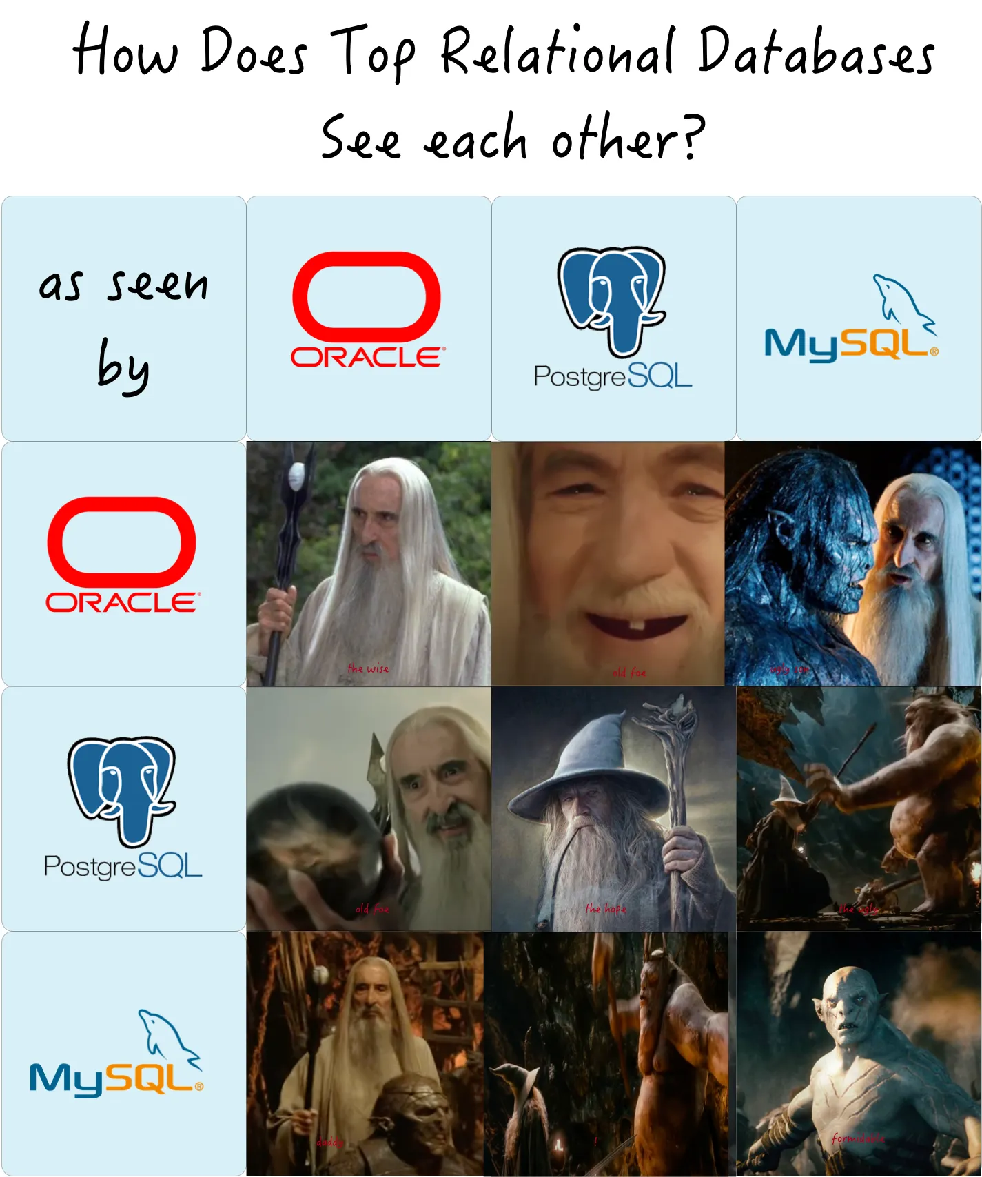关系型数据库的生态位高度重叠,其关系可以视作零和博弈。与PostgreSQL形成直接竞争关系的,就是Oracle与MySQL。