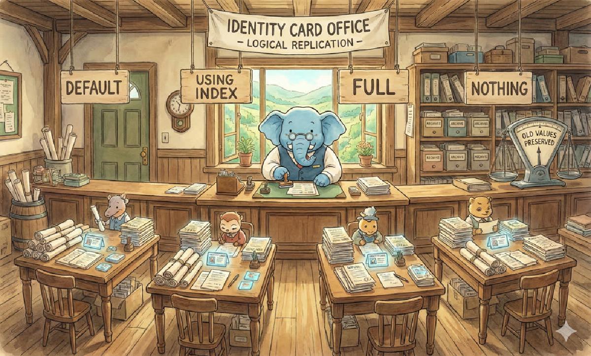 于是,就有了 复制标识(Replica Identity) 的概念。复制标识是对OLD.id这样工作假设的进一步泛化与抽象,它用来告诉逻辑复制系统,哪些信息可以被用于唯一定位表中的一条记录。