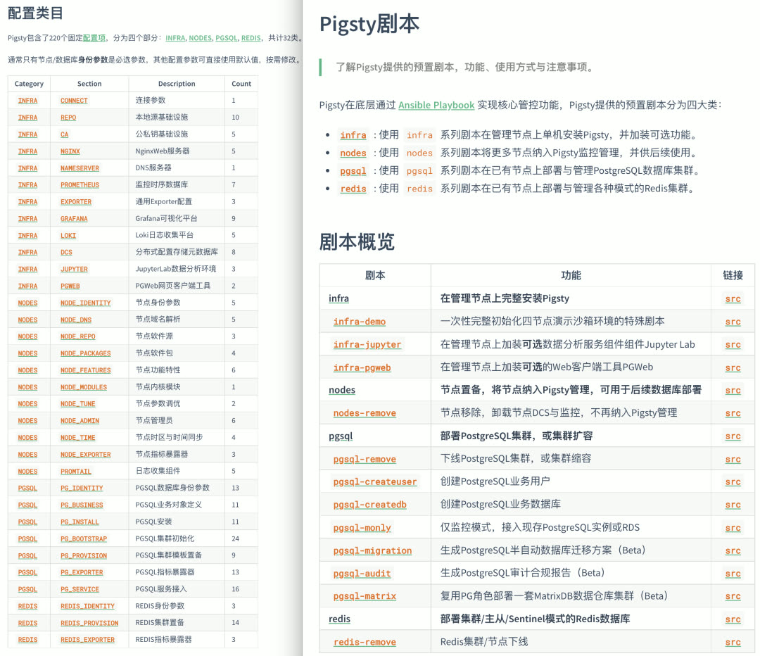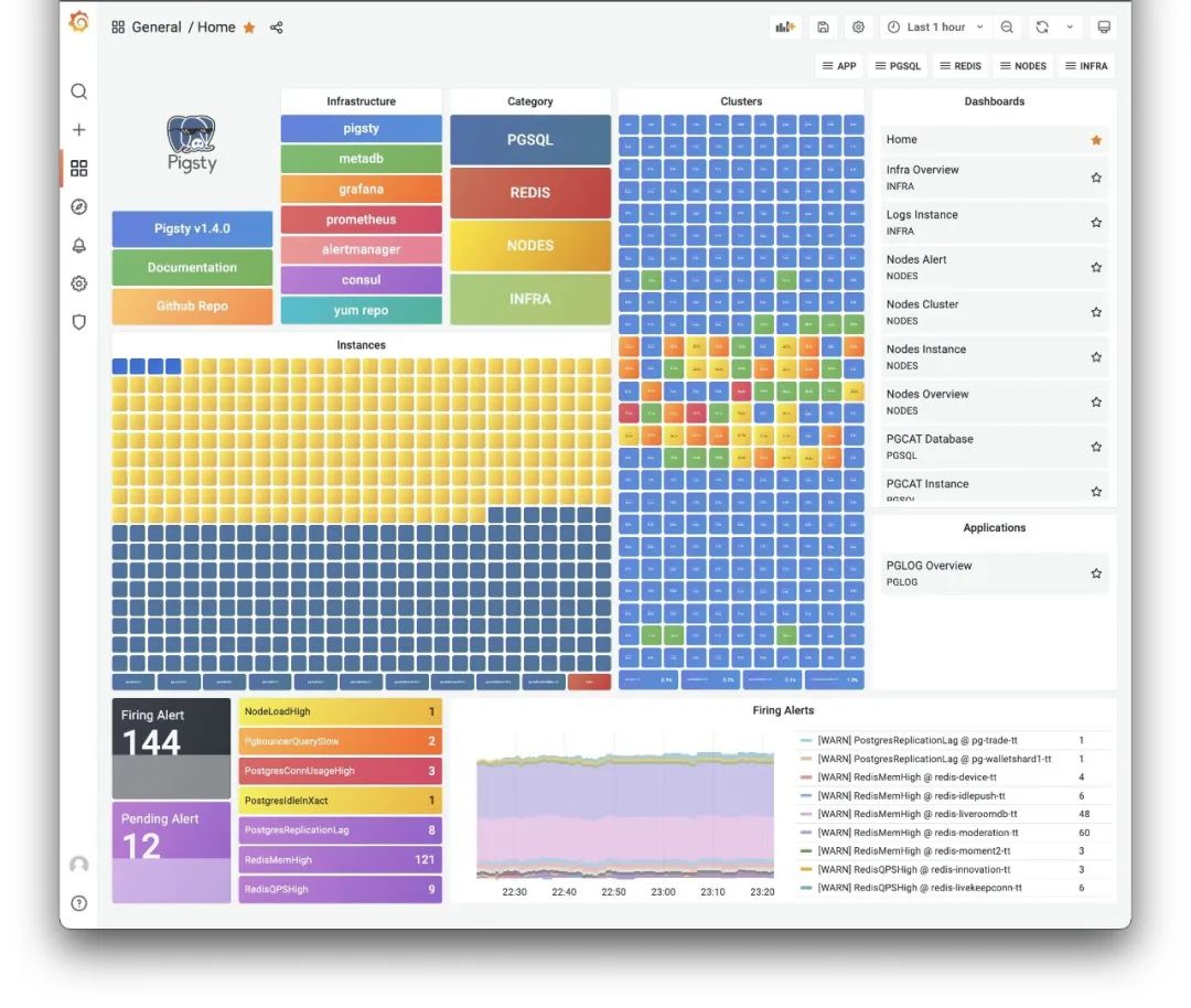 Pigsty v1.4 正式发布!全新的模块化架构:四大内置模块 INFRA、NODES、PGSQL、REDIS 可以独立使用并自由组合;新增时序数据仓库 MatrixDB 部署与监控支持;新建设了全球 CDN 加速下载。