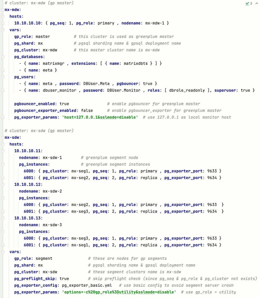 Pigsty v1.4 中,并没有专门的 MATRIXDB 模块,MatrixDB 的部署完全复用了 PGSQL 模块。可以用熟悉的配置参数来配置 MatrixDB。在 Pigsty 看来,一套 MatrixDB 数据仓库在逻辑上就是 N 对标准的一主一从 PGSQL 集群:一个标准的 Master 集群(Master & Standby),以及很多组散布在多个节点上的 Segment 集群(Primary & Mirror)。所有 PGSQL 的面板都可以直接用在 MatrixDB 上。