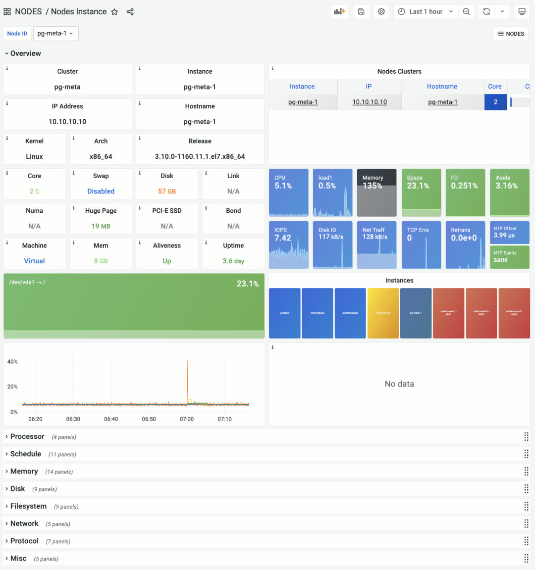 Pigsty v1.4 引入了全新的节点监控功能,这也是模块化改造的一个直接成果。在以前,机器的监控指标是 1:1 与 PostgreSQL 实例绑定的。对于 PostgreSQL 发行版来说,这样的设计没有问题。但随着 Pigsty 的发展,这样的设计开始显得不合时宜。