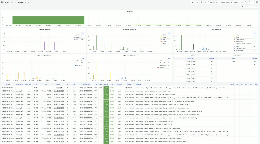 除了 INFRA、NODES、PGSQL、REDIS 四个核心模块外,Pigsty Grafana 的首页还有一个板块:APP。这是留给用户自己应用的。任何带有 APP 和 Overview 标签的监控面版会被列入 Pigsty 的面版导航中。Pigsty 自带了一个开箱即用的小应用 PGLOG,用来分析 PostgreSQL 自身的 CSV 日志,可以快速从日志中定位异常,并快速定位跳转到具体连接的详情页。
