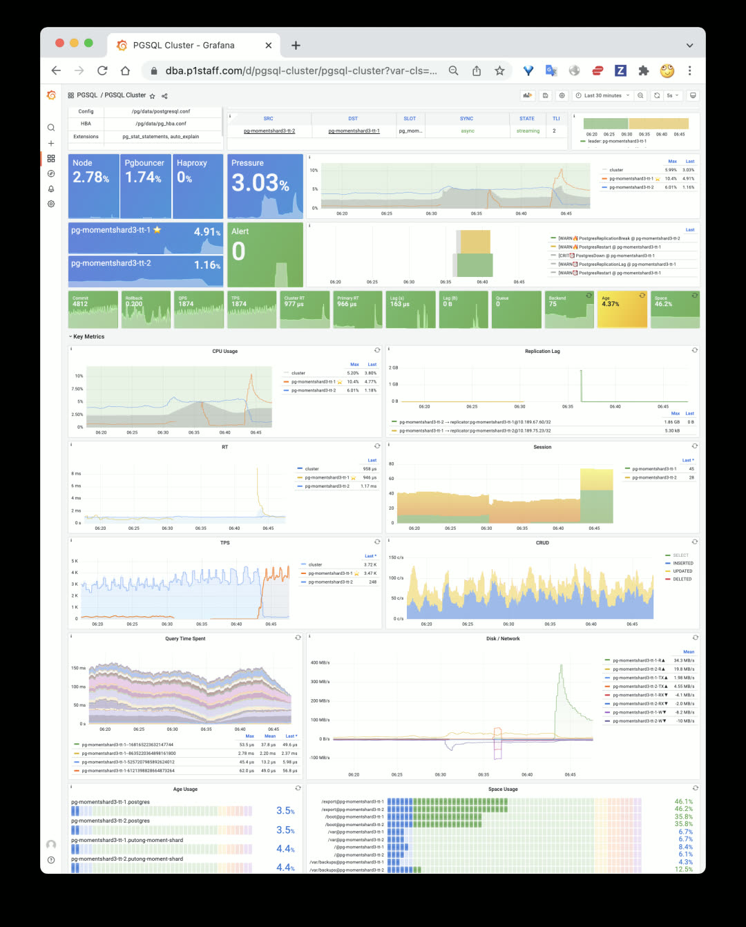 除了集群资源对象,PGSQL Cluster 的首屏只呈现最关键的监控指标、报警事件、集群/实例压力水位。其他细节都隐藏在下面的专题栏中。