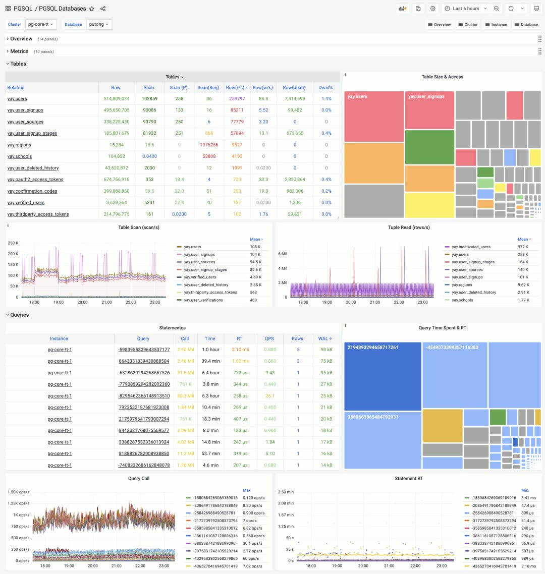 第二个显著改进是新增的 PGSQL Databases 面板。在过去,数据库内监控只关注单个实例内的单个对象。但对于表、索引这样的业务对象,更关注的是它们在整个集群内的整体指标。PGSQL Databases 面板为此而生。可以查询某一个数据库在整个集群内的表现,水平对比集群间不同实例的差异: