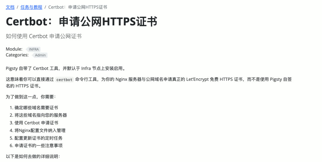 Pigsty 提供全功能的 Nginx 配置方案和证书申请 SOP,其网站和软件仓库就是使用 Pigsty 本身搭建的。