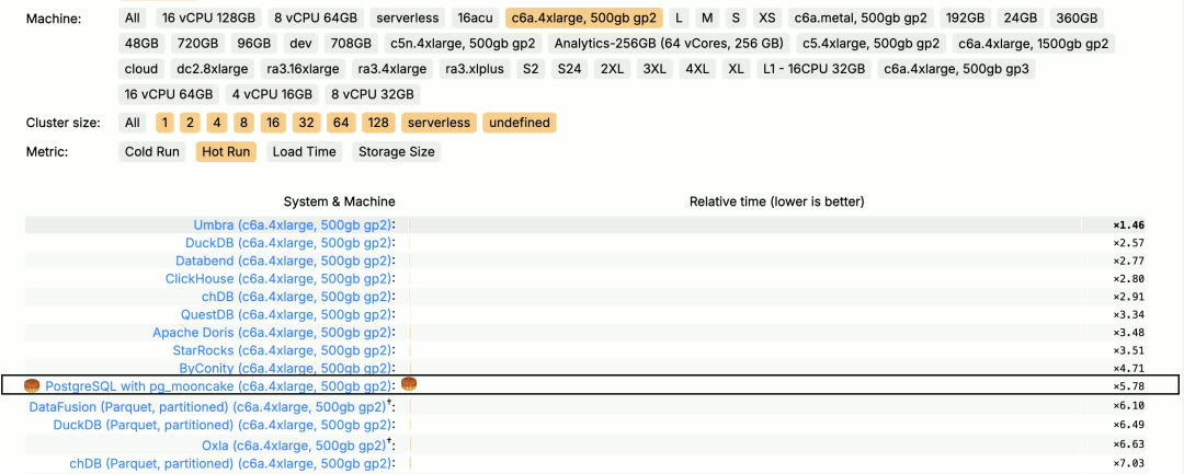 在 ClickHouse 自家榜单 ClickBench 上,PG 扩展 mooncake 已成功挤进 Top 10 T1 梯队。在激烈的竞争角逐下,PostgreSQL 生态很快会出现比肩向量数据库生态中 pgvector 的 OLAP 玩家。