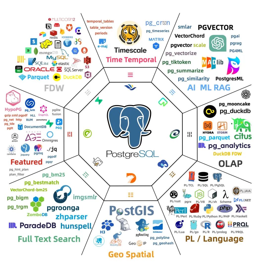 PostgreSQL 以其丰富的扩展机制著称,孕育了庞大的数据库生态。Pigsty 将 PostgreSQL 的插件扩展能力发挥到极致。