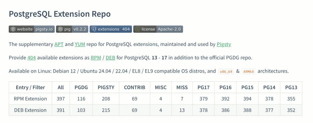 虽然独一无二的扩展库可作为 Pigsty 的核心竞争优势,但更希望为 PostgreSQL 生态做出更多贡献。因此 pig 包管理器与 PostgreSQL 扩展仓库基于 Apache 2.0 宽松协议开源,对公众与同行开放。