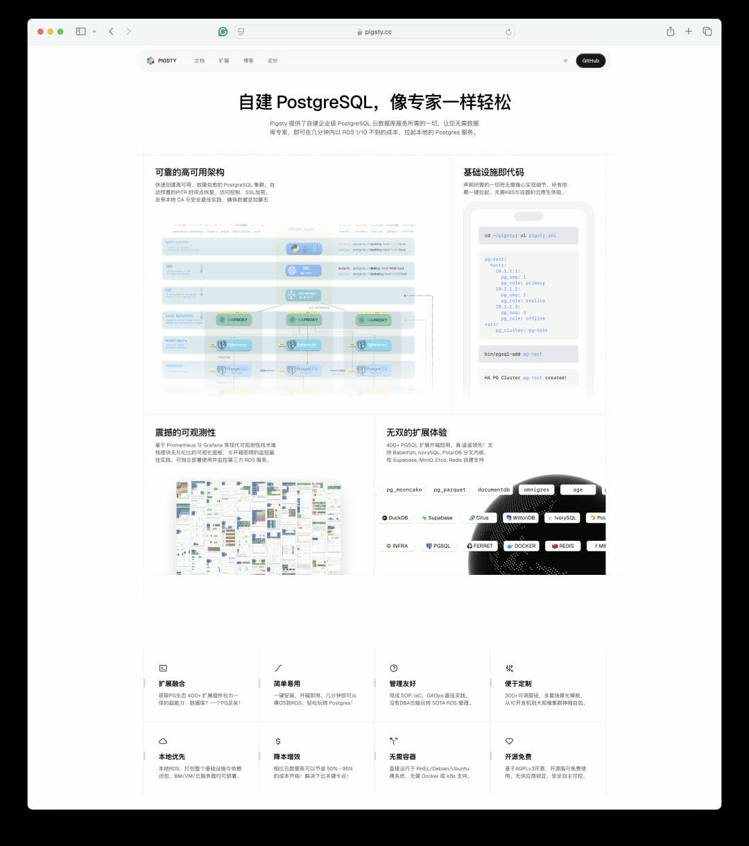 Pigsty 不仅是 PostgreSQL 发行版,还是完整的监控基础设施、Etcd、MinIO、Redis、Docker 部署管理方案,甚至可作为 Web 建站工具。