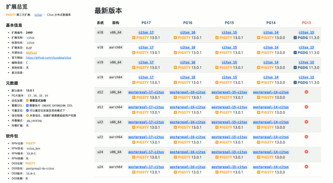 pig build ext citus # 构建某个扩展Pigsty 维护的 200+ 扩展均通过此方式构建。即使操作系统不在 Pigsty 支持的十大发行版中,也可轻松 DIY 扩展 RPM/DEB 包。