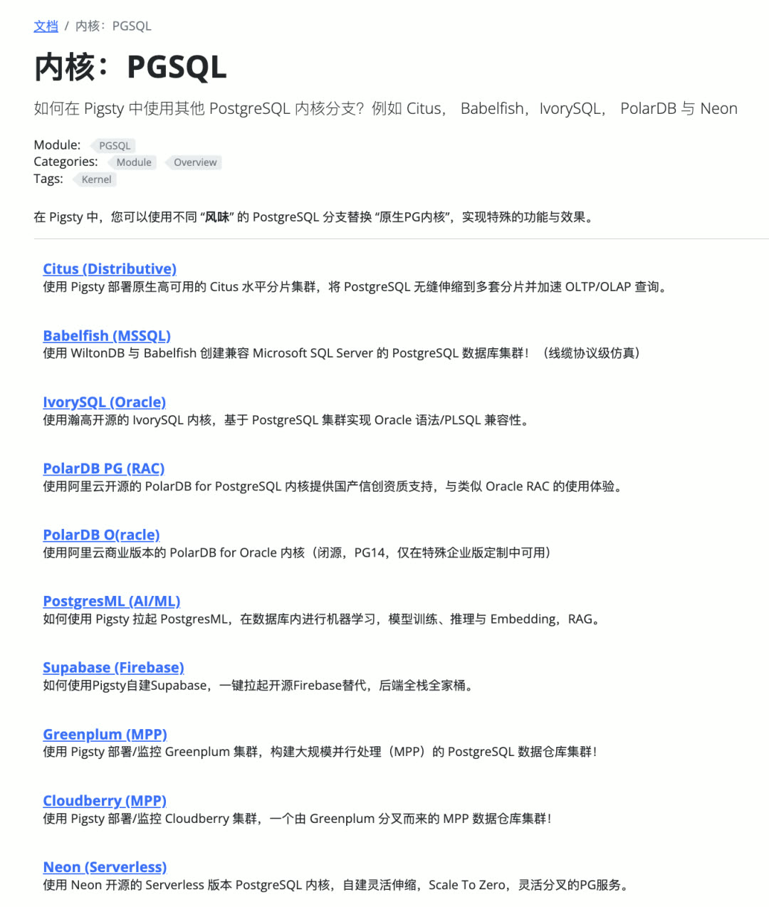 PG 扩展目录已整合到文档站 pigsty.cc/ext 中,并提供中文版本。小工具可自动扫描 Pigsty 与 PGDG 仓库扩展包版本并生成数据库记录、信息页,用户可直接从网页浏览并下载扩展 RPM/DEB 包。
