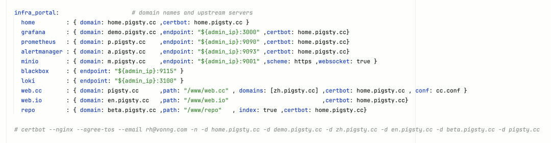 Pigsty v3.2 已将 certbot 整合并默认安装,可一行命令完成 HTTPS 证书申请与续签。可用 Nginx 代理各种服务,使用不同域名区分,统一收口到 80/443 端口对外服务 —— 只需打开入站 80/443 TCP 端口即可。