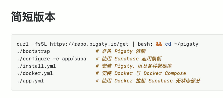 许多软件都会用到 PostgreSQL,此前 Pigsty 提供 Docker Compose 模板,但用户仍需手动拷贝目录、修改 .env 配置、手工拉起。