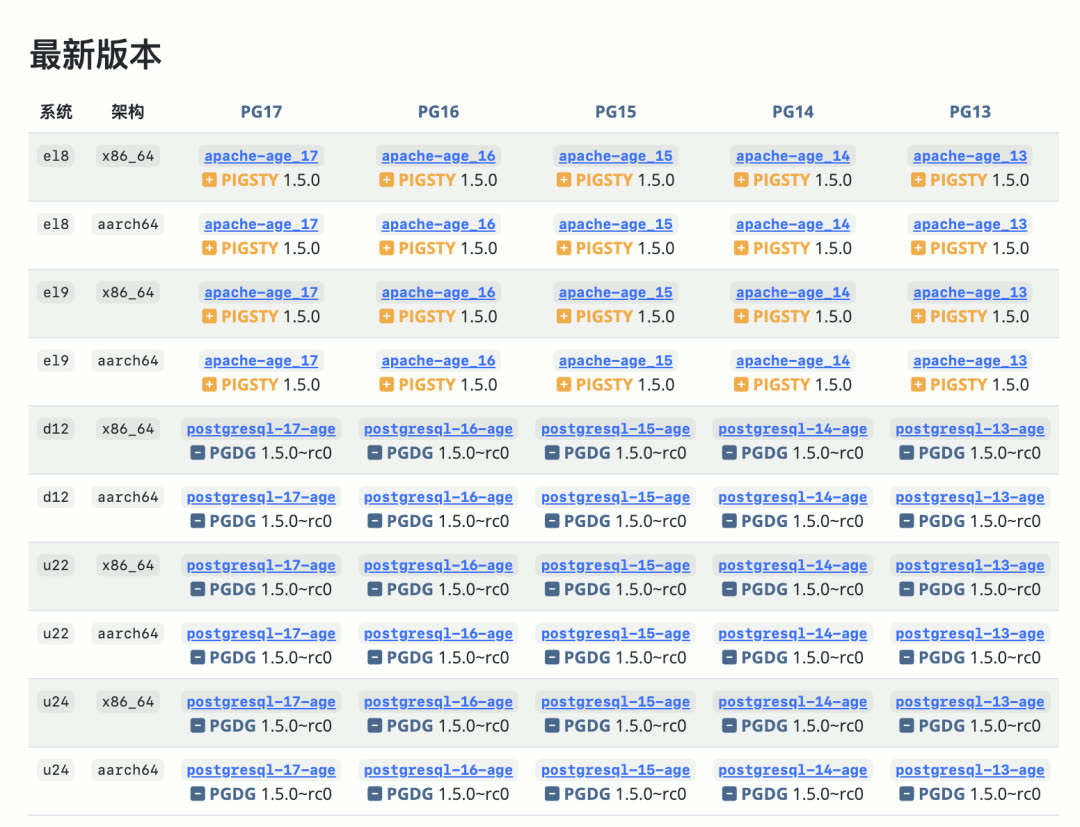 Apache AGE 图数据库扩展:该项目的开发者似乎被裁员,基本进入无维护状态。作为发行版,Pigsty 尽力为其提供支持 —— 根据 Debian 上的 Patch 重新编译了 AGE 1.5.0 的 PG 13-17 扩展,补上了缺少 EL RPM 的遗憾。