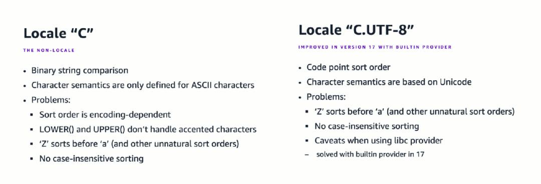 C:兼容性最好,所有系统都支持,但缺少 Unicode 字符集知识,除 ASCII 外的字符大小写功能失灵C.UTF-8:在C基础上实现 Unicode 语义,更符合用户直觉,但并非所有系统默认支持- PostgreSQL 17 新特性:内置对这两种 Collation 的支持,不再依赖操作系统的 libc