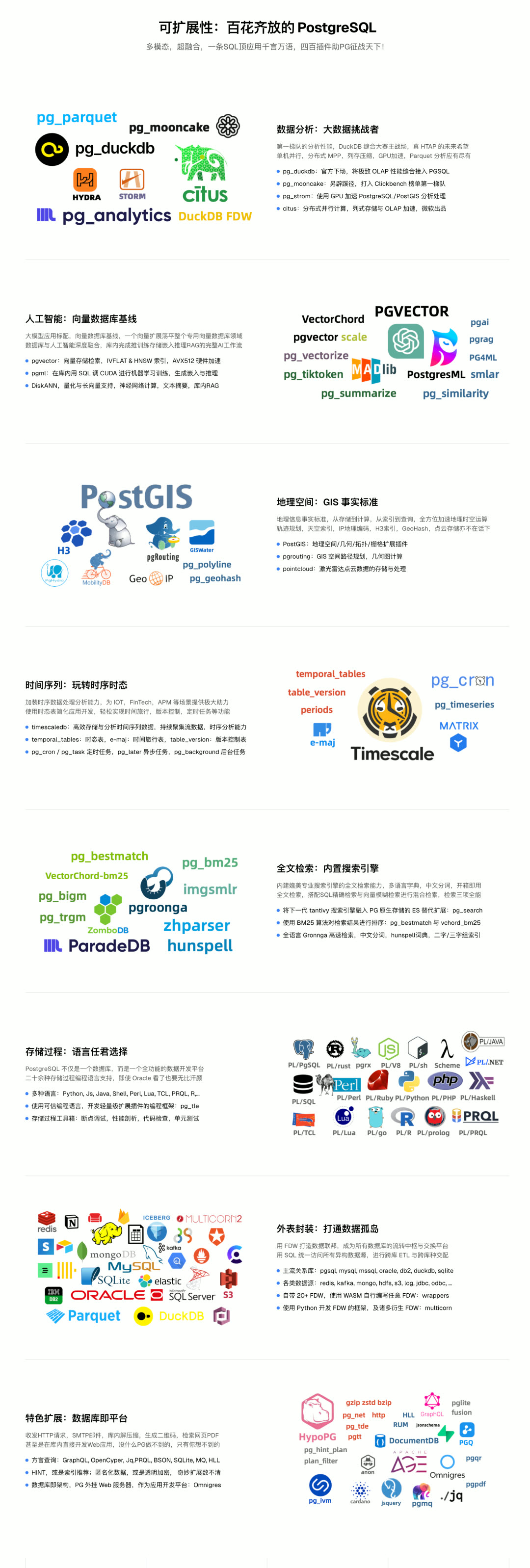 v3.4 新增扩展 pgspider_ext,利用各种 FDW 实现多数据源查询。同时有 28 个扩展更新至最新版本,并修复了若干扩展的版本与 Bug。