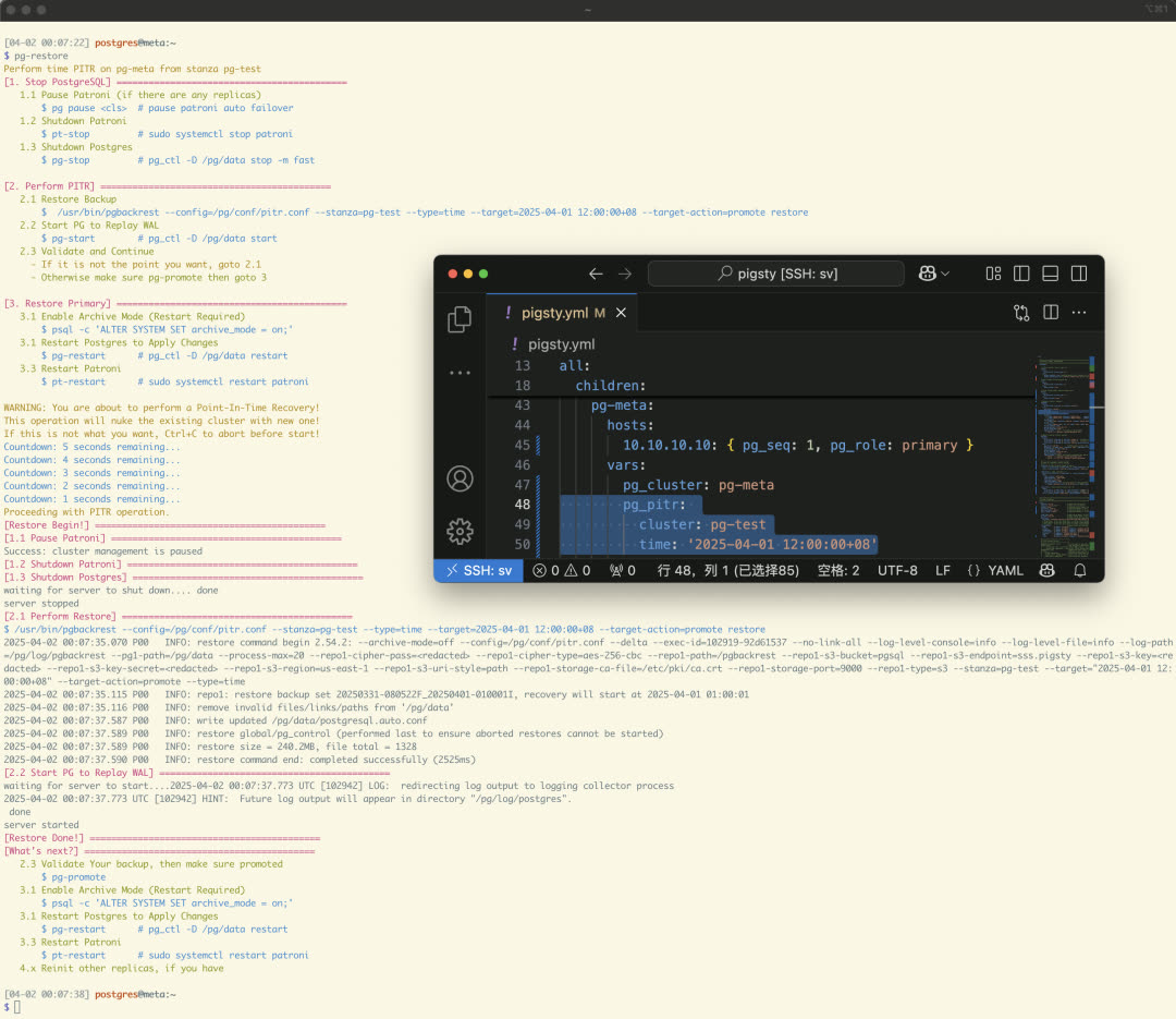 时间点恢复是关系型数据库的核心功能。此前 Pigsty 通过 pg-pitr 辅助用户执行半自动 PITR。v3.4 对 PITR 支持进行了显著改进,现可方便地从集中式备份仓库中选择任意备份进行恢复。