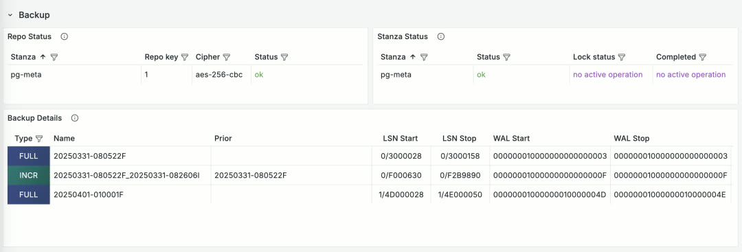 备份监控方面,v3.4 引入了 pgbackrest_exporter 用于收集备份监控指标,PGSQL PITR 监控面板也会显示当前备份状态。此前用户只能通过 PGCAT Instance 查询当前状态,而无历史记录,本次改进对分析备份状态大有帮助。