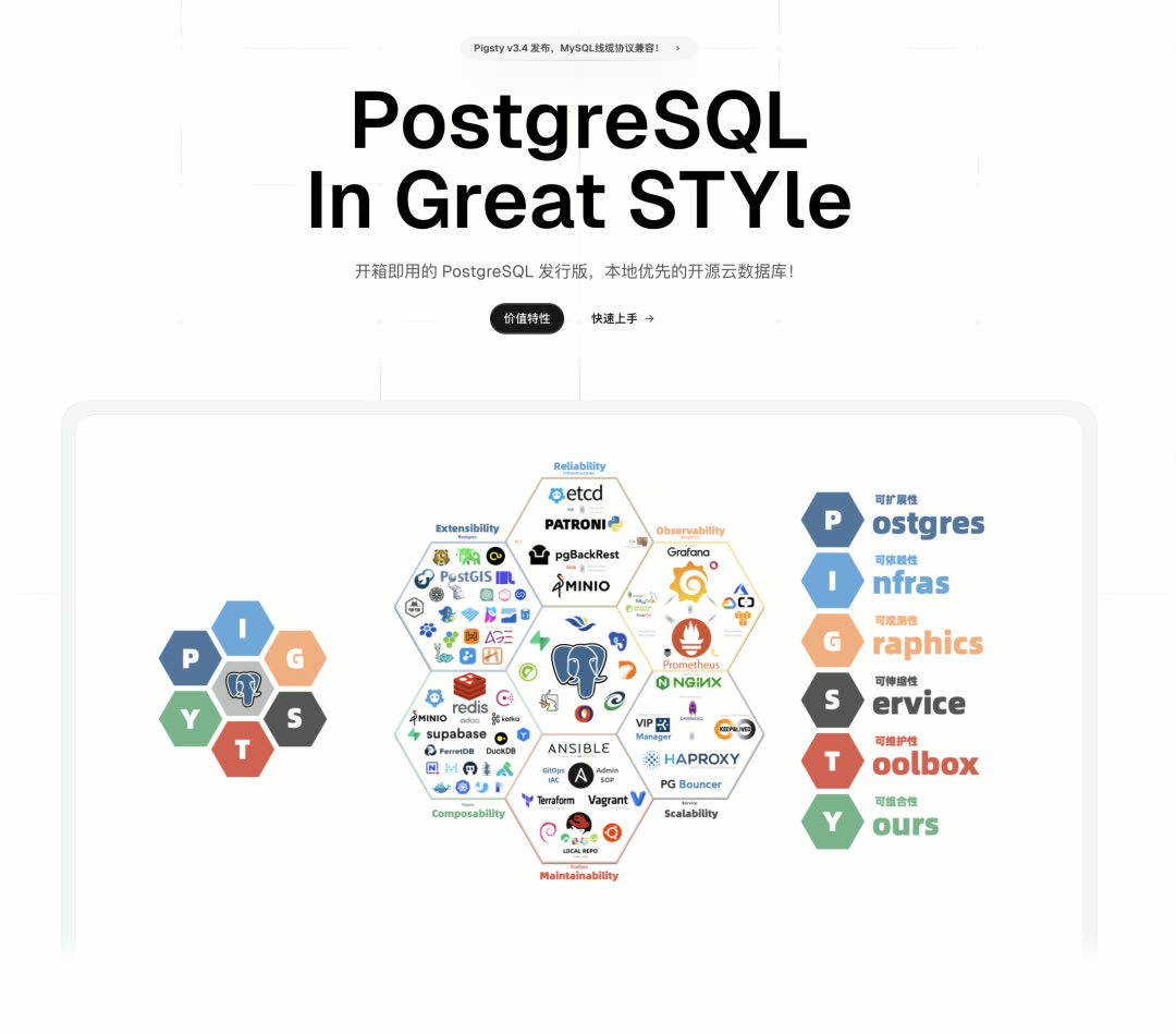 Pigsty 是一个开箱即用的 PostgreSQL 数据库发行版,可视为数据库的"自动驾驶软件"。它能让用户以云 RDS 十分之一不到的成本,在无需专业 DBA 的情况下,快速拉起企业级 PostgreSQL 数据库服务 —— 具备高可用、PITR、监控系统、IaC 能力,以及 421 个 PG 生态扩展插件,直接运行在 10 个主流 Linux 发行版上,无需容器或 Kubernetes。