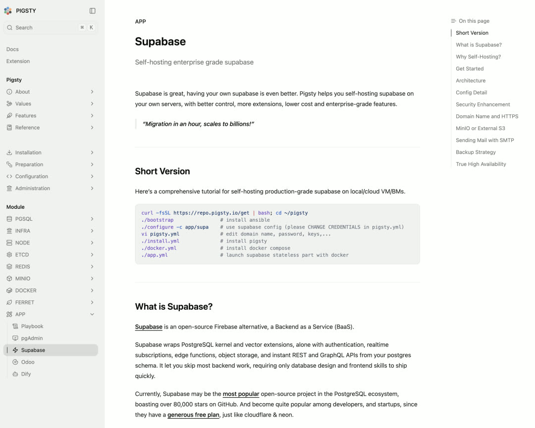 Pigsty 提供的"企业级" Supabase 自建能力广受欢迎 —— Supabase 自建教程的页面流量甚至超过了 Landing Page。本版本进一步优化了 Supabase 自建流程。