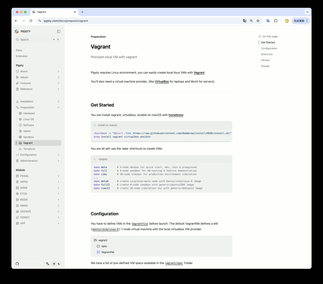 Pigsty 提供 Vagrant / Terraform 沙箱模板,允许用户在本地/云端轻松拉起所需的虚拟机资源。此前 Vagrant / VirtualBox 对 Apple ARM 架构支持存在各种问题,经过重新测试,Vagrant + VirtualBox 组合现已在 Apple Silicon 上丝滑运行。