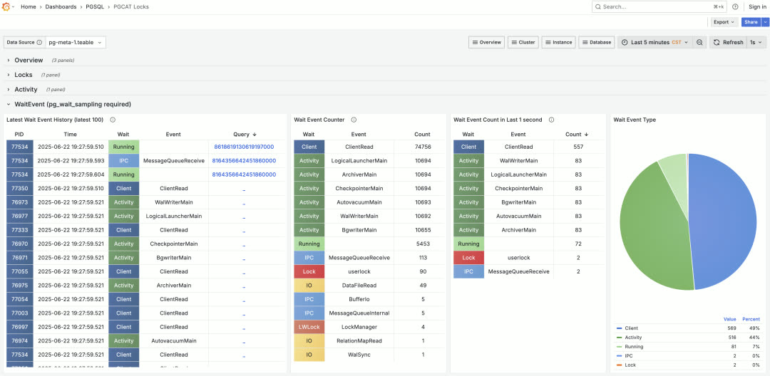 PG 内核本身只提供当前活动的等待状态,但没有历史等待事件记录。这只能通过插件实现 —— pg_wait_sampling 和 pgsentinel 都提供了此功能,监控面板也已支持等待事件分析。